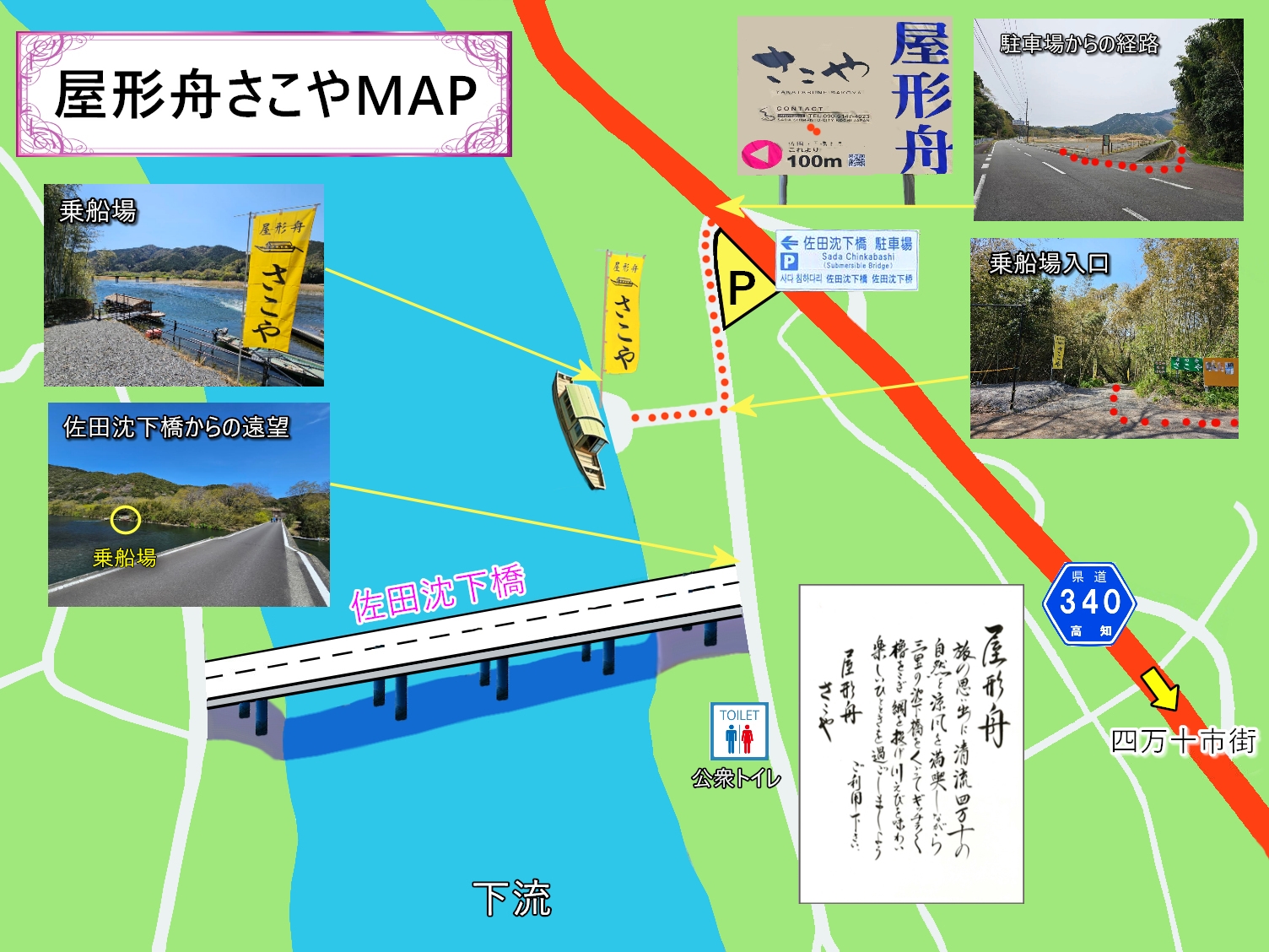 | 舟乗り場 | 知県四万十市佐田(今成)沈下橋たもと(中村駅より車で15分) |